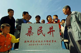 10月11日,遼寧省喀喇沁左翼蒙古族自治縣甘招鄉(xiāng)河沿村大楊樹屯的村民們?cè)凇坝H民井”石碑前。