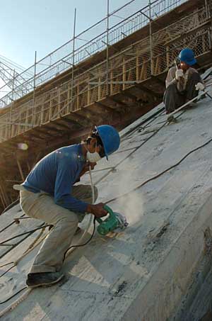 22日,兩名中國(guó)工人在蘇丹首都喀土穆以北的麥羅維大壩施工現(xiàn)場(chǎng)施工。麥羅維大壩位于喀土穆以北約450公里處的尼羅河上,由中國(guó)水利電力對(duì)外公司和中國(guó)水利水電建設(shè)集團(tuán)公司承建,是迄今為止中國(guó)企業(yè)承包的最大國(guó)際工程,也是蘇丹乃至非洲目前在建的最大水電項(xiàng)目。大壩于2003年7月開工,預(yù)期2008年完工。