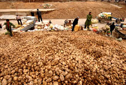 金秋十月,青海省互助土族自治縣近30萬畝馬鈴薯喜獲豐收。青海省互助土族自治縣生產(chǎn)的馬鈴薯具有優(yōu)質(zhì)豐產(chǎn)、退化慢等優(yōu)良特點(diǎn),產(chǎn)品在國內(nèi)市場十分暢銷。這是青海省互助土族自治縣農(nóng)民在搬運(yùn)即將外銷的馬鈴薯。