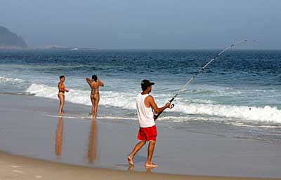 10月30日,一名男子在巴西里約熱內(nèi)盧的海灘釣魚。盡管這里還處在春季,但溫暖舒適的天氣使得當(dāng)?shù)鼐用褚呀?jīng)提前享受到充滿陽(yáng)光的海灘生活。
