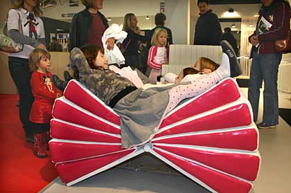 4日,小朋友們在意大利羅馬新國際展覽中心舉辦的家具展上體驗新式沙發(fā)。為期9天的羅馬國際家具展當天在羅馬新國際展覽中心閉幕。節(jié)省空間、新穎別致和極具人性化的設(shè)計風格是本屆展會的突出特點。