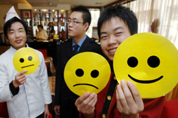 11月12日,一餐館服務(wù)人員在展示餐館衛(wèi)生狀況“表情”符號(hào)。近日,銀川市衛(wèi)生局開始在全市5000多家餐飲單位實(shí)施餐館衛(wèi)生狀況“表情”公示制度,通過卡通形象將餐飲衛(wèi)生狀況按良好、一般、較差區(qū)別,以加強(qiáng)餐飲單位的衛(wèi)生安全監(jiān)督管理。