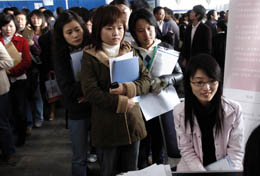 11月20日,畢業(yè)生在用人單位招聘攤位前洽談、應(yīng)聘。當(dāng)日,江蘇省暨南京市2008屆普通高校畢業(yè)生公益供需洽談會在南京國際展覽中心舉行,900多家用人單位提供2.5萬多個(gè)職位,通過江蘇省高校畢業(yè)生就業(yè)網(wǎng)與用人單位對接、匹配而篩選出的五萬多名畢業(yè)生免費(fèi)入場應(yīng)聘。江蘇省2008屆普通高校畢業(yè)生達(dá)42.7萬人,比2007年增加七萬多人,畢業(yè)生人數(shù)再創(chuàng)歷史新高。 |