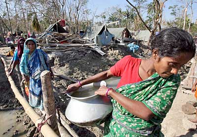 25日,在孟加拉國的強熱帶風(fēng)暴“錫德”受災(zāi)地區(qū),一名婦女往自己的帳篷里運水。孟加拉國三軍總參謀官馬蘇德當日在首都達卡對媒體表示,強熱帶風(fēng)暴“錫德”對孟造成的經(jīng)濟損失初步估算達23.1億美元。