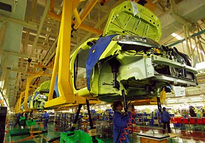11月27日,長安汽車集團在2007年長安汽車海外商務(wù)大會上向媒體透露,長安汽車整車出口呈現(xiàn)高速增長態(tài)勢,預計2007年汽車整車出口量將首次突破4萬輛。圖為工人在長安奔奔轎車生產(chǎn)線上工作(資料照片)。