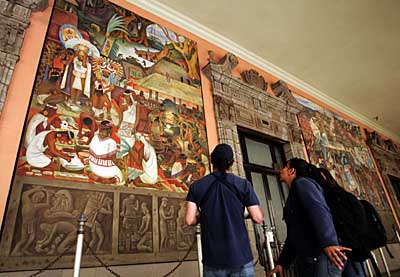 4日,在墨西哥城的國(guó)民宮,游人參觀剛剛維修過(guò)的墨西哥著名壁畫家迭戈·里維拉創(chuàng)作的反映古代印第安人生活的壁畫。