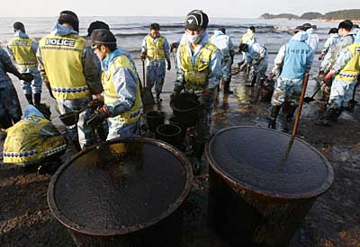 9日,志愿者在韓國(guó)忠清南道泰安郡附近的海灘上清理泄漏的原油。韓國(guó)海洋水產(chǎn)部長(zhǎng)官姜武賢9日說(shuō),韓國(guó)西部海域發(fā)生的原油泄漏事故已造成大面積環(huán)境污染,預(yù)計(jì)清理工作將持續(xù)兩個(gè)月。一艘在香港注冊(cè)的油輪7日在韓國(guó)忠清南道泰安郡西北海域與一艘韓國(guó)駁船相撞,超過(guò)1萬(wàn)噸的原油漏入大海。