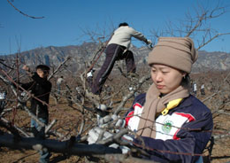 12月13日,河南農(nóng)業(yè)大學(xué)林學(xué)園藝學(xué)院的幾名大學(xué)生在果園幫助果農(nóng)修剪果樹(shù)。近日,河南農(nóng)業(yè)大學(xué)林學(xué)園藝學(xué)院的160名本科生和研究生,來(lái)到位于太行山腳下的河南省沁陽(yáng)市紫陵鎮(zhèn)紫陵村萬(wàn)畝無(wú)公害經(jīng)濟(jì)林園區(qū),開(kāi)展為期一周的社會(huì)實(shí)踐活動(dòng)。學(xué)生們對(duì)當(dāng)?shù)毓r(nóng)進(jìn)行技術(shù)培訓(xùn),并幫助果農(nóng)對(duì)桃樹(shù)、杏樹(shù)、梨樹(shù)進(jìn)行冬季剪枝管理。 |