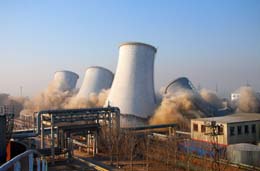 12月23日中午,大慶油田對(duì)投產(chǎn)于1964年的龍鳳熱電廠冷卻水塔群成功實(shí)施定向爆破,服役了43年的燃油熱電裝置被施行“安樂(lè)死”。專(zhuān)業(yè)爆破人員在6座塔身鉆孔16800個(gè)用于安放炸藥。精確的設(shè)計(jì)部署,使爆破得以順利完成,也使周邊生產(chǎn)裝置和附近居民生活未受絲毫影響。 這是爆破現(xiàn)場(chǎng)(12月23日攝)。 |
