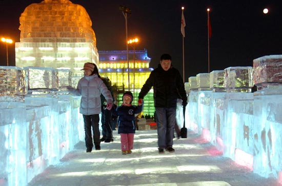 12月23日,游客在哈爾濱冰雪大世界內(nèi)參觀。當(dāng)日,以“冰雪世界、奧運(yùn)夢(mèng)想”為主題的哈爾濱第九屆冰雪大世界試開園迎客。本屆冰雪大世界通過冰雪語(yǔ)言塑造奧林匹克的起源、發(fā)展,整個(gè)冰雪大世界布局為體育賽場(chǎng),參觀路線為賽場(chǎng)跑道,使游人仿佛置身于“體育世界”之中。 本屆冰雪大世界占地40公頃,主景區(qū)占地20公頃,用冰量12萬(wàn)立方米,用雪量10萬(wàn)立方米,可以同時(shí)容納5萬(wàn)游人。 | |