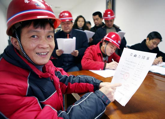 | 12月25日,農(nóng)民工與用工單位簽訂勞動(dòng)合同書。當(dāng)日,四川華鎣星星建設(shè)集團(tuán)按照2008年1月1日正式實(shí)施的《勞動(dòng)合同法》有關(guān)規(guī)定,與在集團(tuán)務(wù)工的1300多名農(nóng)民工分別簽訂了勞動(dòng)合同書。據(jù)悉,截至當(dāng)日,華鎣市已有2.8萬(wàn)名農(nóng)民工按照《勞動(dòng)合同法》的規(guī)定與用工單位正式簽訂了2008年度的勞動(dòng)用工合同。 | |