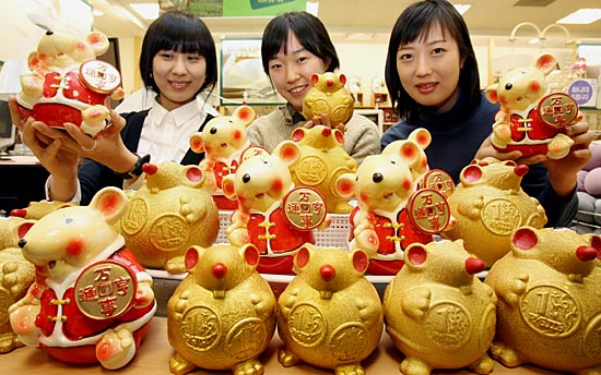 2008年1月1日,在韓國首都首爾的一家商場,售貨員展示老鼠造型的存錢罐。2008年是農(nóng)歷鼠年,韓國商家借機(jī)推出了各種老鼠造型的用品。