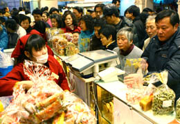 上海市農(nóng)委近日發(fā)布的消息顯示,上海年貨市場日趨龐大,單以農(nóng)產(chǎn)品為例,上海目前年均農(nóng)產(chǎn)品交易總額已達900億元左右,其中歲末年初的年貨市場規(guī)?蛇_100億元。