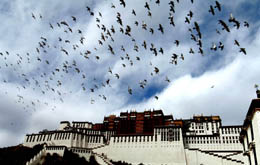 1月10日,一群野鴿子在布達拉宮上空翱翔。