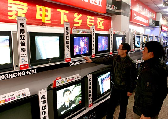| 1月15日,四川省華鎣市雙河辦事處昭勛村的農(nóng)民在“家電下鄉(xiāng)”網(wǎng)點(diǎn)選購彩電。近日,四川省啟動(dòng)“家電下鄉(xiāng)”試點(diǎn)工作。農(nóng)民購買補(bǔ)貼范圍內(nèi)的彩電、冰箱、手機(jī)類產(chǎn)品,憑有效證件可到當(dāng)?shù)氐泥l(xiāng)鎮(zhèn)財(cái)政所申領(lǐng)“家電下鄉(xiāng)”補(bǔ)貼,標(biāo)準(zhǔn)為家電產(chǎn)品銷售價(jià)格的13%。 | |