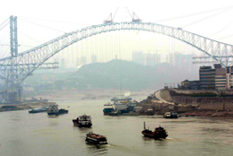 船只正從建設(shè)中的重慶朝天門長江大橋下通過(1月17日攝)。朝天門長江大橋?yàn)楣奋壍澜煌▋捎娩撓涮峄@拱特大橋,主拱跨度達(dá)552米。目前主體工程完成過半,建設(shè)進(jìn)展順利,該大橋預(yù)計在2008年內(nèi)建成通車。