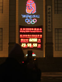 1月20日,一名攝像師在拍攝中國國家博物館前的倒計時牌。當日,北京迎來2008年奧運會倒計時200天。