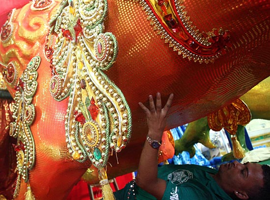 22日,在巴西里約熱內(nèi)盧的桑巴城,一名工人正在裝飾狂歡節(jié)花車。桑巴城是里約12支頂級(jí)桑巴舞隊(duì)的花車制造基地,隨著狂歡節(jié)的臨近,各支隊(duì)伍都在抓緊進(jìn)行花車裝飾工作。