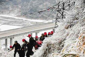 連日來,貴州電力部門每幢大樓的各個(gè)辦公室里,燈光徹夜通明;冰雪與濃霧覆蓋的大深山里,到處可見掛著“電力搶險(xiǎn)”警示牌的工程車,艱難地穿行在鋪滿冰碴泥濘的山道上;風(fēng)雪中的鐵塔、電桿周圍,1.7萬多名工人奮戰(zhàn)在搶險(xiǎn)一線。 風(fēng)大、雪大、霧大,交通中斷,給搶險(xiǎn)工作增加了更大難度。在通往塔基的道路上,厚厚的覆冰像鏡面般光滑,搶修人員身負(fù)沉重?fù)屝薰て骶,鞋上捆綁著草繩,艱難地向現(xiàn)場(chǎng)挺進(jìn)。被凍的電桿無法攀登,他們就用稻草燃燒融冰,融一步登一步…… 面對(duì)這場(chǎng)幾十年不遇的冰雪災(zāi)難,省委號(hào)召全省上下萬眾一心,團(tuán)結(jié)奮戰(zhàn)。為支持電力部門搶險(xiǎn),貴州各地、州、市以及縣鄉(xiāng)的黨政機(jī)關(guān)和氣象、安監(jiān)、公安交警、醫(yī)療救護(hù)等部門,通力配合,共同制定應(yīng)對(duì)措施,把食品、藥品、木炭、衣被等送到搶修現(xiàn)場(chǎng),做好后勤保障,盡快恢復(fù)當(dāng)?shù)厣、生產(chǎn)用電。目前,不僅是電力工人,全省已組織機(jī)關(guān)干部職工、武警、消防官兵以及青年志愿者等數(shù)十萬人,奔赴各事故現(xiàn)場(chǎng),與當(dāng)?shù)厝罕娨黄穑贡葹?zāi)。