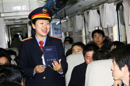 1月31日凌晨,列車長(zhǎng)在車廂內(nèi)向旅客介紹停車時(shí)的安全事項(xiàng)。 當(dāng)日6時(shí)許,往返于沈陽和廣州間、因暴風(fēng)雪晚點(diǎn)近80個(gè)小時(shí)的T12/T14次列車在經(jīng)過了6天6夜的艱難旅程后,安全返回沈陽北站。面對(duì)幾十年不遇的冰雪災(zāi)害,沈陽鐵路局沈陽客運(yùn)段T12/T14次“三八乘務(wù)組”的64名女乘務(wù)員以頑強(qiáng)的意志和耐心細(xì)致的服務(wù)克服了列車嚴(yán)重超員、食品飲用水缺乏等諸多困難,贏得了旅客的理解和支持,與3000多名旅客一起平安返回家園。 |