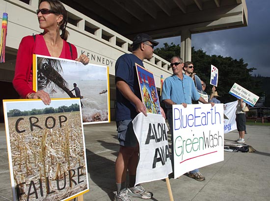 1月30日,環(huán)保人士在美國夏威夷檀香山第二次“主要經(jīng)濟體能源安全與氣候變化會議”會場外示威,呼吁人們減少污染、保護地球資源。
