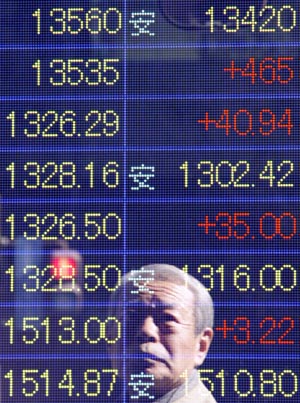 14日,在日本首都東京,一名男子在觀看顯示市場(chǎng)信息的電子顯示牌。日本內(nèi)閣府當(dāng)日公布的初步統(tǒng)計(jì)數(shù)據(jù)顯示,去除物價(jià)變動(dòng)因素后,2007年第四季度日本國(guó)內(nèi)生產(chǎn)總值比上季度增長(zhǎng)0.9%,按年率計(jì)算增幅為3.7%,這是日本經(jīng)濟(jì)連續(xù)第二個(gè)季度出現(xiàn)增長(zhǎng)。新華社/路透 | |