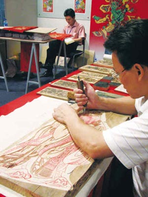 年畫如今在城市里已很少能見到,而藝人刻版技藝表演也只有在展覽會(huì)中才能參觀到。陳輝/攝 | 年畫市場(chǎng)復(fù)蘇