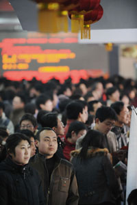 2月14日,應(yīng)聘者在閱讀招聘信息。 當(dāng)日,“2008年山西省春季大型人才招聘暨大中專畢業(yè)生就業(yè)洽談會(huì)”正式開幕。本次人才交流大會(huì)為期兩天,前來參加招聘會(huì)的用人單位包括上市公司、國有大中型企業(yè)、民營企業(yè)、高新技術(shù)企業(yè)以及大中專院校、科研院所等共300余家,提供約8000多個(gè)工作崗位。據(jù)了解,約有包括應(yīng)往屆大中專畢業(yè)生在內(nèi)的各類社會(huì)求職者1萬2千人前來應(yīng)聘。另外,根據(jù)人事部等部門的相應(yīng)要求,山西人才市場對所有應(yīng)聘者一律免收入場費(fèi),求職者信息免費(fèi)登記并錄入人才信息庫。 |