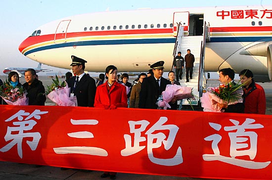 2月19日,中國東方航空公司的一架空客A340大型客機(jī)在上海浦東國際機(jī)場第三跑道試飛成功。據(jù)悉,第三跑道為4F等級,可起降未來全球最大的客機(jī)A380。這條跑道計(jì)劃于2008年3月13日正式投入使用,將大大提高浦東機(jī)場運(yùn)量保障能力,也標(biāo)志上海成為全國首個(gè)擁有4條機(jī)場跑道的城市。