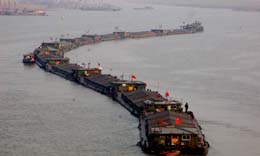 2月21日,安徽淮南市外運電煤船隊宛如一條舞動的長龍通過淮河黃金水道。