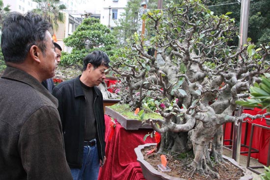 近日,由福建龍海市政府和福建省花卉協(xié)會盆景分會共同主辦的福建盆景藝術(shù)精品展在龍海市舉辦。來自海峽兩岸的268件盆景藝術(shù)作品參展,吸引了廣大市民前來觀賞。圖為市民在參觀獲得金獎的作品《春風(fēng)化雨》。
