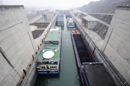 2月23日,船舶在三峽船閘閘室內(nèi)等待過(guò)閘。 2008年,交通部長(zhǎng)江三峽通航管理局將確保三峽過(guò)壩通航貨運(yùn)量達(dá)到1億載重噸,改寫2007年6580萬(wàn)噸的歷史紀(jì)錄。為此,該局將采取多種措施確保貨船平均待閘時(shí)間小于8小時(shí),客船平均待閘時(shí)間小于兩小時(shí)。 |
