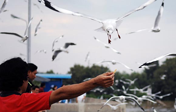 24日,游客在位于泰國(guó)中部北欖府挽布縣的挽布鳥類濕地保護(hù)區(qū)給鳥喂食。挽布鳥類濕地保護(hù)區(qū)是泰國(guó)最大的濱海人工鳥類濕地保護(hù)區(qū)。保護(hù)區(qū)人工種植數(shù)十萬(wàn)株紅樹,在固沙保堤的同時(shí)成為鳥類棲息的家園,目前共有包括棕頭鷗、白鷺、翠鳥等140多種鳥類季節(jié)性在此棲息繁衍。