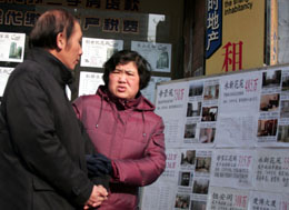 兩位看房人在上海宛平南路的一家房產(chǎn)中介門(mén)前交談(2月16日攝)。據(jù)悉,上海商品住宅成交均價(jià)上周每平方米為9767元。這是自2007年4月以來(lái),上海商品住宅成交均價(jià)首次跌破每平方米1萬(wàn)元。