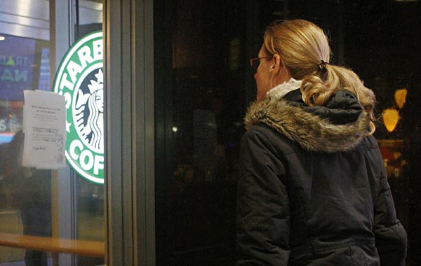 26日,一名行人在美國紐約一家星巴克咖啡店外觀看閉店通知。美國咖啡連鎖店巨頭星巴克當日將全國7100家分店關(guān)閉3小時,對所有員工進行烹制咖啡的培訓。目前美國餐飲連鎖行業(yè)競爭激烈,因遭遇麥當勞等競爭對手挑戰(zhàn),星巴克上周宣布裁員600人。新華社/路透