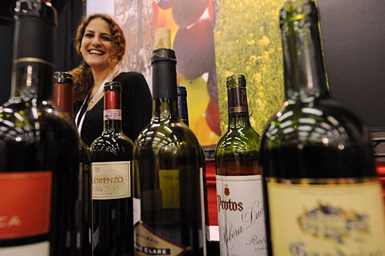 27日,在以色列海濱城市特拉維夫舉行的以色列國際紅酒展上,一名參展者展示葡萄酒。當(dāng)日,為期3天的以色列第二屆國際紅酒展在特拉維夫的會(huì)展中心向公眾開放。