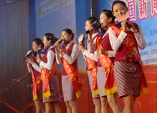 2月27日,南航空姐在演唱選拔賽主題曲。當(dāng)天,中國(guó)南方航空公司招聘空姐新聞發(fā)布會(huì)在京舉行。據(jù)悉,本次招聘工作將從3月開(kāi)始,預(yù)計(jì)于今年8月結(jié)束。新華社發(fā)