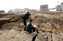 3月1日,監(jiān)測(cè)人員在地陷現(xiàn)場(chǎng)進(jìn)行勘測(cè)。從2月29日下午開始,武漢長江干堤附近一在建小區(qū)內(nèi)發(fā)生大面積地表塌陷。這一地表塌陷災(zāi)害發(fā)生在離長江干堤100余米處,沿長江干堤形成了一條近300米長的地陷帶。地陷中心形成了長約105米、寬達(dá)47米、最深處約6米的坑道。