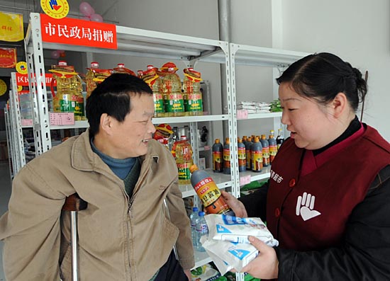 3月11日,南京市秦淮區(qū)夫子廟街道“慈善超市”的一名工作人員(右)幫助低保受助人員戴德元挑選商品。日前,南京市秦淮區(qū)夫子廟街道“慈善超市”在新址開張,店內(nèi)的大部分商品是捐贈品,價格分市場價、愛心價和慈善價三種。市場價等同普通超市的價格;愛心價要比市場價上浮20%,顧客可以自愿選擇愛心價獻愛心;而慈善價要比市場價低10%,主要針對城市受助的特困人群。超市所得純利潤充入慈善基金,用于對特困群眾的幫扶。目前,南京市已建立了116家街道慈善超市。