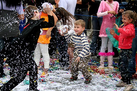 9日,在塞浦路斯南部城市利馬索爾舉行的狂歡節(jié)閉幕游行上,幾名兒童相互拋灑紙屑。2月28日開幕的利馬索爾狂歡節(jié)當(dāng)晚落下帷幕。