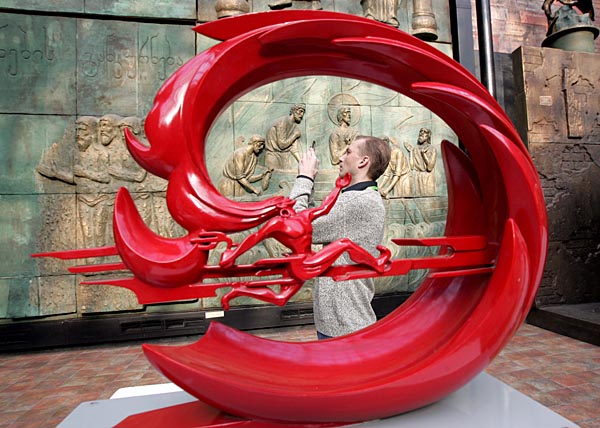 2008奧運(yùn)景觀雕塑方案征集大賽及國際巡展莫斯科站日前開幕,數(shù)十件以2008奧運(yùn)為主題的雕塑作品與觀眾見面。圖為一名俄羅斯觀眾在莫斯科“采烈捷利藝術(shù)畫廊”拍攝參展的奧運(yùn)題材雕塑作品。
