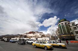 3月19日,車輛行駛在拉薩北京中路布達拉宮前。目前,拉薩市區(qū)各個路段車輛自由通行,大部分商店恢復(fù)營業(yè),高校以及中小學(xué)正常上課,拉薩社會秩序基本恢復(fù)正常。