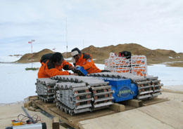 這是我國第24次南極科考隊(duì)員在進(jìn)行冰雪面移動(dòng)機(jī)器人的現(xiàn)場(chǎng)實(shí)驗(yàn)準(zhǔn)備工作(2007年12月22日攝)。冰雪面移動(dòng)機(jī)器人可自主跨越冰裂縫、翻越雪坡和雪丘,自重300公斤,最大作業(yè)半徑為25公里,可搭載40公斤的重量,拖曳100公斤的重量。 在中國第24次南極科學(xué)考察活動(dòng)期間,我國科考隊(duì)員成功開展了科考機(jī)器人的現(xiàn)場(chǎng)實(shí)驗(yàn),這項(xiàng)研究在我國20多年的南極考察活動(dòng)中尚屬首次。 |