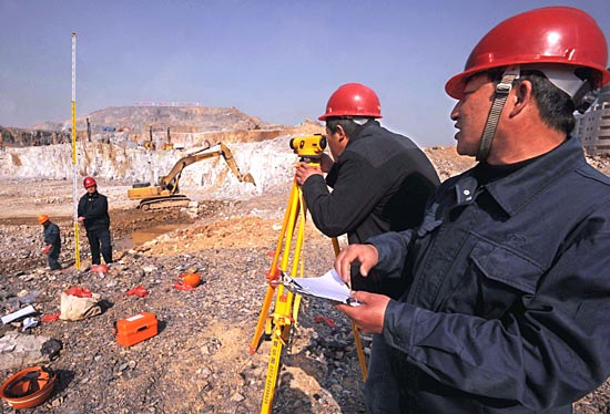 3月24日,技術人員在測量秦山核電站擴建項目核島負挖工程施工參數(shù)。