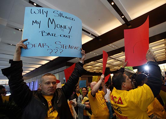 26日,在美國知名投資銀行貝爾斯登位于紐約曼哈頓的總部大樓內(nèi),一名美國鄰里協(xié)助公司的抗議者手持寫有“為什么用我的錢援助貝爾斯登”的紙片抗議。大約60名抗議者當(dāng)天闖入貝爾斯登的總部大樓,抗議美國聯(lián)邦儲備委員會為貝爾斯登提供特別融資援助,要求為眾多貸款買房者提供幫助。新華社/路透