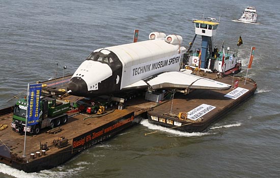 7日,一艘駁船運載著前蘇聯(lián)“暴風雪”號航天飛機行駛在德國西部韋瑟爾附近的萊茵河上!氨╋L雪”號無人駕駛航天飛機將在德國施派爾展出,它將是世界上第一艘向普通觀眾展出的航天飛機原型!氨╋L雪”號于1988年11月15日發(fā)射升空,成功繞地球飛行兩圈后降落。新華社/路透