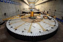 這是一臺正在組裝中的三峽右岸電站水輪發(fā)電機組的轉子。經(jīng)過建設者多年的艱苦奮戰(zhàn),三峽工程初步設計中的26臺70萬千瓦機組已有21臺機組并網(wǎng)發(fā)電。目前,右岸余下的5臺機組安裝均按計劃有序進行,將于2008年底全部投產(chǎn)。