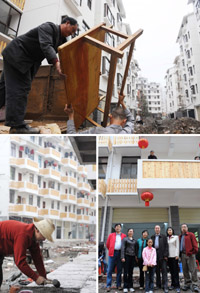 上圖:4月13日,湖北省興山縣高陽鎮(zhèn)一戶移民正在搬家。左下圖:4月13日,高陽鎮(zhèn)一位工匠在鋪設(shè)新居門口的地磚。右下圖:4月13日,一戶剛搬進新居的移民在新居前拍下全家福。 目前,三峽庫區(qū)最后一個移民集鎮(zhèn)——湖北省興山縣高陽鎮(zhèn)正加緊移民搬遷,預計5月底將搬遷結(jié)束。高陽鎮(zhèn)位于三峽庫區(qū)的支流香溪河畔,是通往神農(nóng)架、鄂西的咽喉。受地理條件限制,該鎮(zhèn)采取了在原址筑堤回填造地,使原地抬高22米,在新造地上建設(shè)移民住房的辦法進行移民安置。