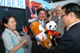 4月15日,一位俄羅斯商人在琶洲展館進(jìn)口展區(qū)向中國(guó)客人贈(zèng)送象征雙方友好的玩具禮物。