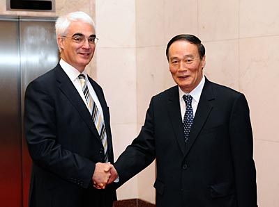 4月15日,首次中英經(jīng)濟財金對話在北京舉行。國務(wù)院總理溫家寶的特別代表、國務(wù)院副總理王岐山和英國首相布朗的特別代表、財政大臣達(dá)林共同主持對話,兩國經(jīng)濟、財政、金融、貿(mào)易、外交等部門負(fù)責(zé)人與會。這是對話開始前,王岐山與達(dá)林握手。